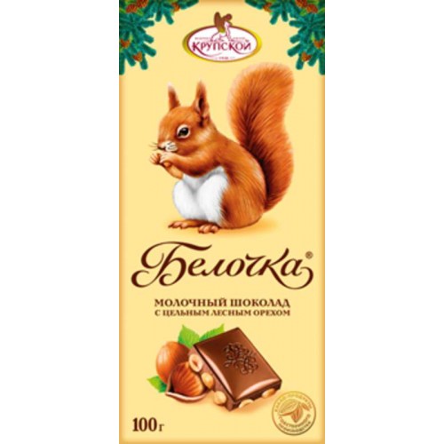 Шоколад молочный 100 грамм "Белочка" производства кондитерской фабрики имени Крупской можно купить оптом с доставкой по Москве, Подмосковью и ЦФО. Низкая цена обусловлена отсутствием посредников при наличии прямого договора с производителем.  Все актуальные сертификаты в наличии. Минимальный заказ: 1 коробка